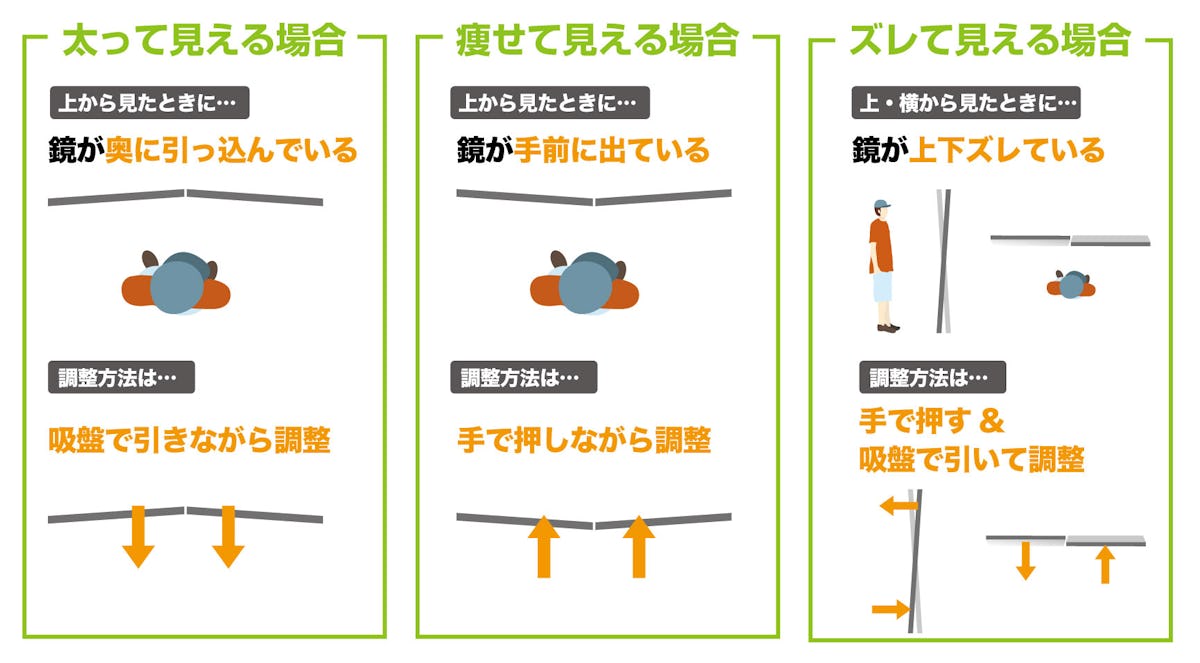 つなぎ目に段差ができていないかを触って確認したり、離れて見て、映像に違和感がないかを確認しましょう。二重に見えるときは、鏡を手で押します。切れて見えるときは、鏡を吸盤で引っ張ります。