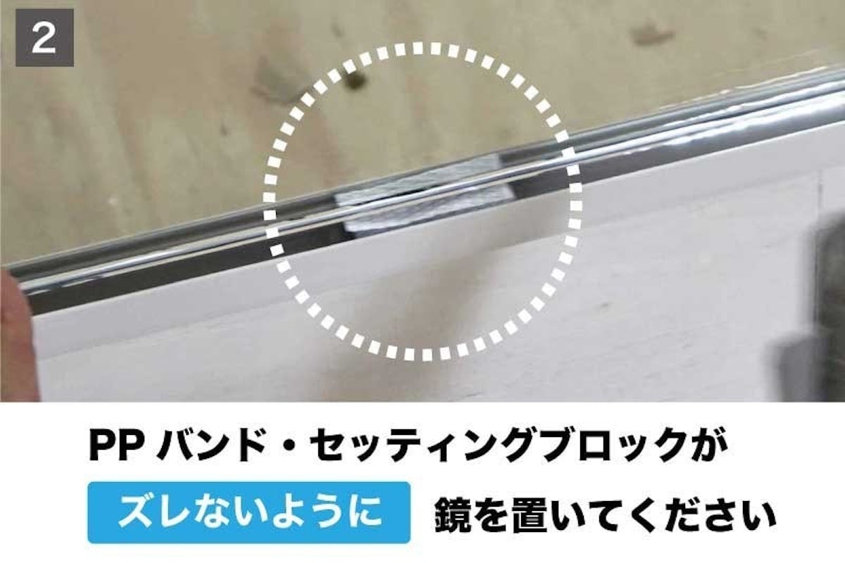 傾いている箇所にPPバンドを挟み込むことで、高さを調節します。鏡が垂直になるまで、PPバンドを重ねて微調整していきます。