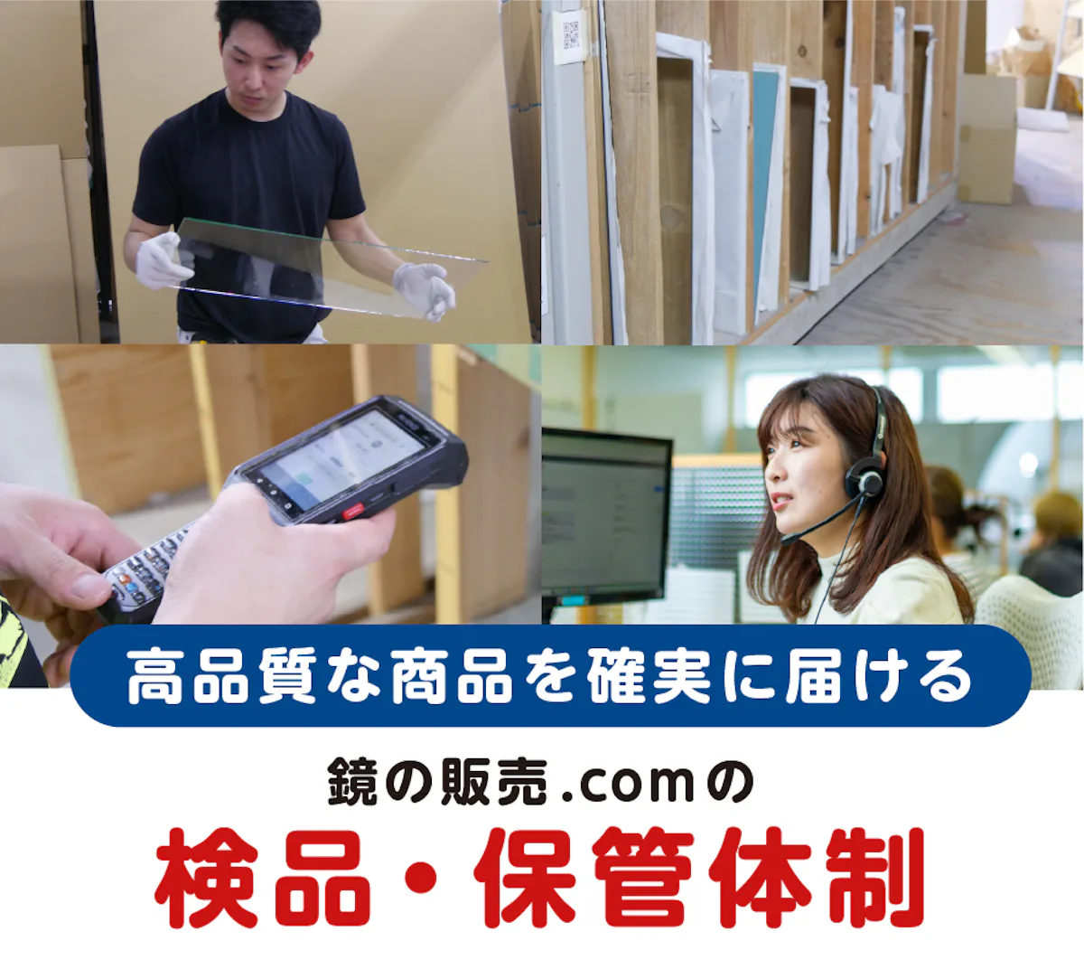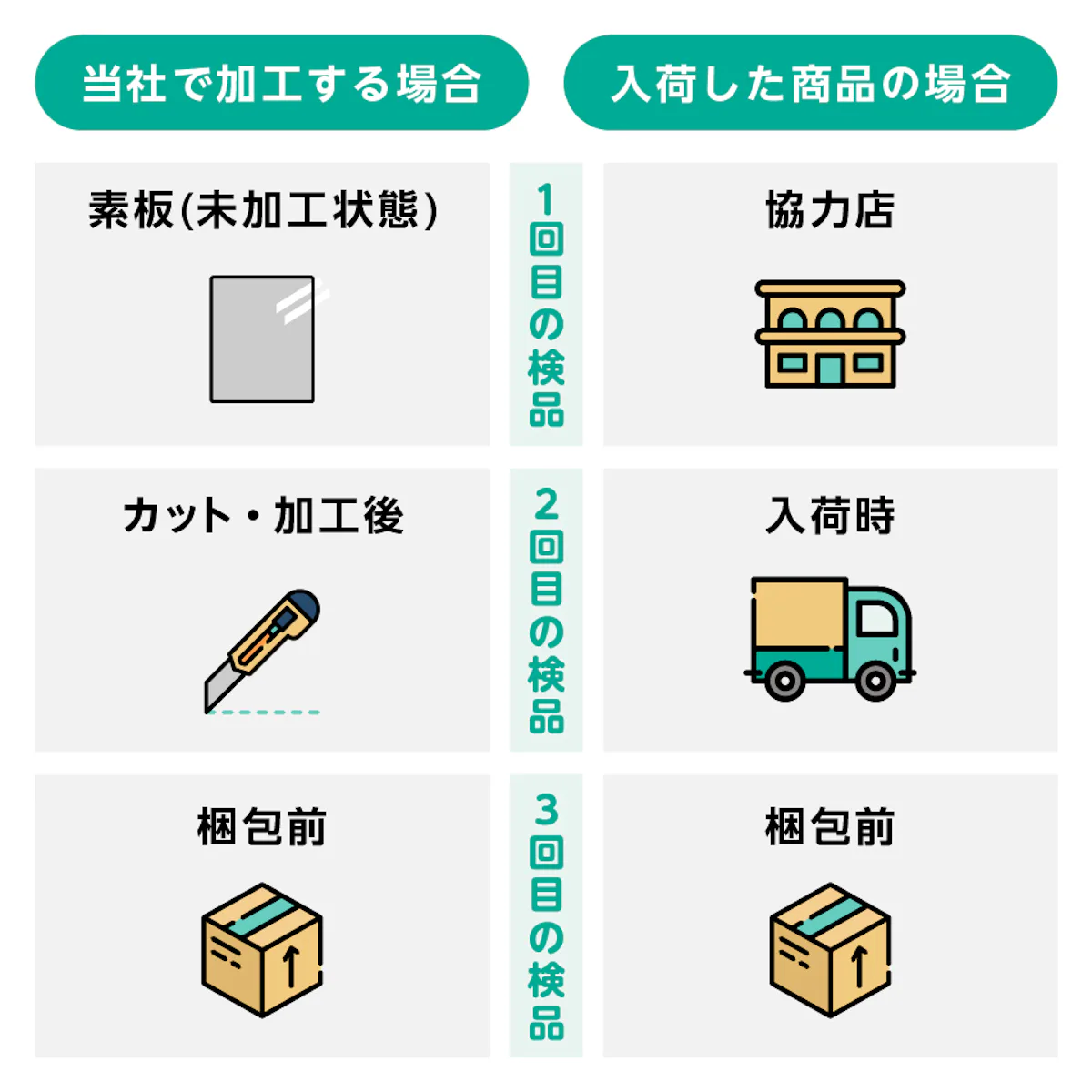 商品を当社でカット・加工する場合、「素板の状態」「カット後の状態」「梱包前の状態」と合計3回の検品を行っています。協力店様から入荷した商品の場合も同様に、合計3回の検品を行います。