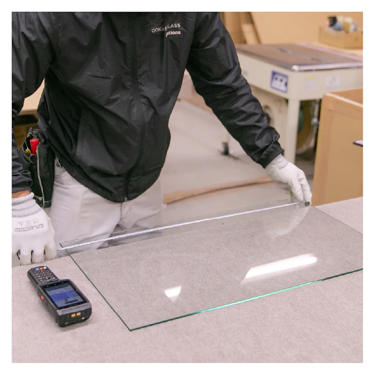メジャーやガラス拭きタオル、ガラス用洗剤なども使い、汚れやキズのない綺麗な状態でお届けできるように心がけています。