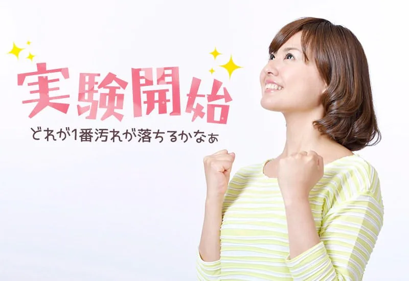 さっそく実験をしていきます。先ほど説明した鏡につけた汚れ4種類を順に落としていきます。