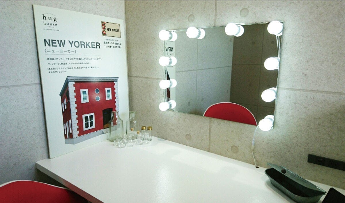 シンプルでかっこいい雰囲気のメイクルームですね。ハリウッドミラーは、鏡の周りの壁に電球を取り付けているものが多いですが、こちらのお客様は鏡に直接電球を取り付けていらっしゃいます。こちらの方が、電球の明かりも反射して拡大し、明るさが増していいですね。これで天候や照明に左右されずメイクがしやすくなりますね。