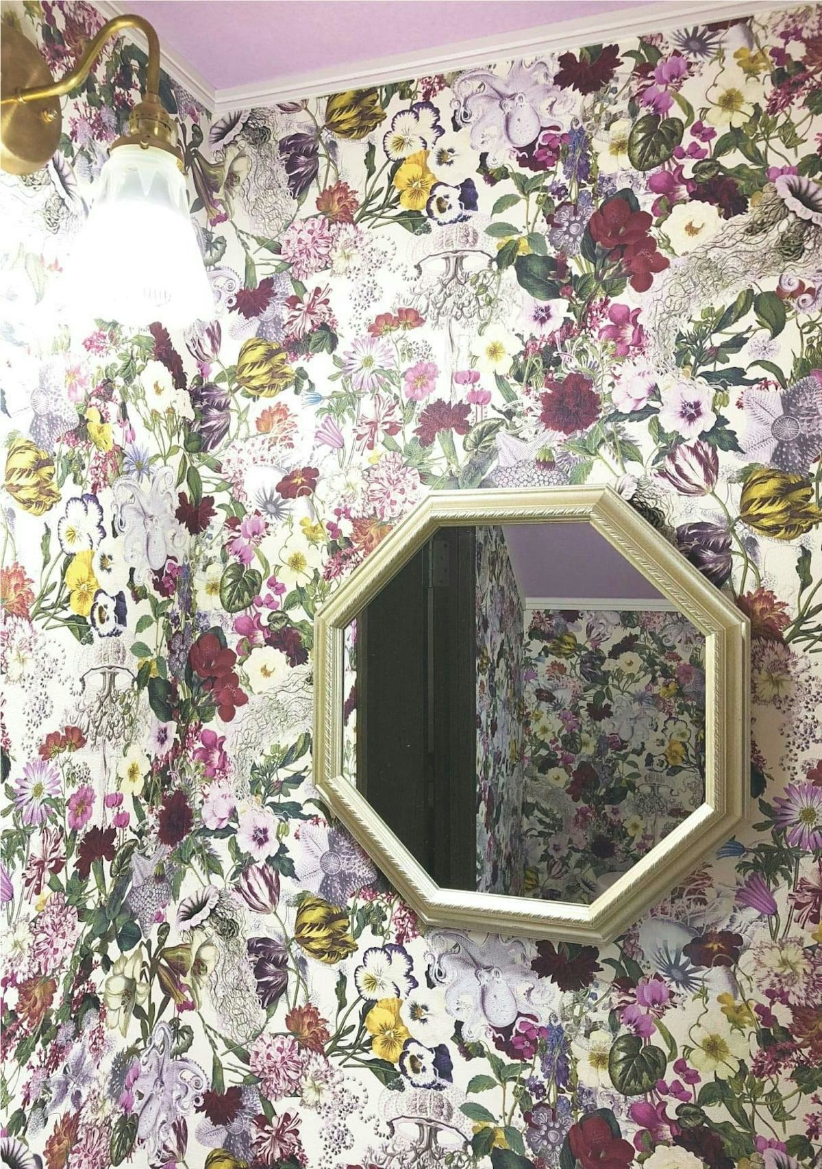 今回ご注文いただいたのは「アンティーク調八角形ミラー(シルバー)」です。シルバーにしたことで、色鮮やかな壁紙や照明とうまく馴染んでいます。照明もアンティーク調のデザインなので相性ばっちりですね。
