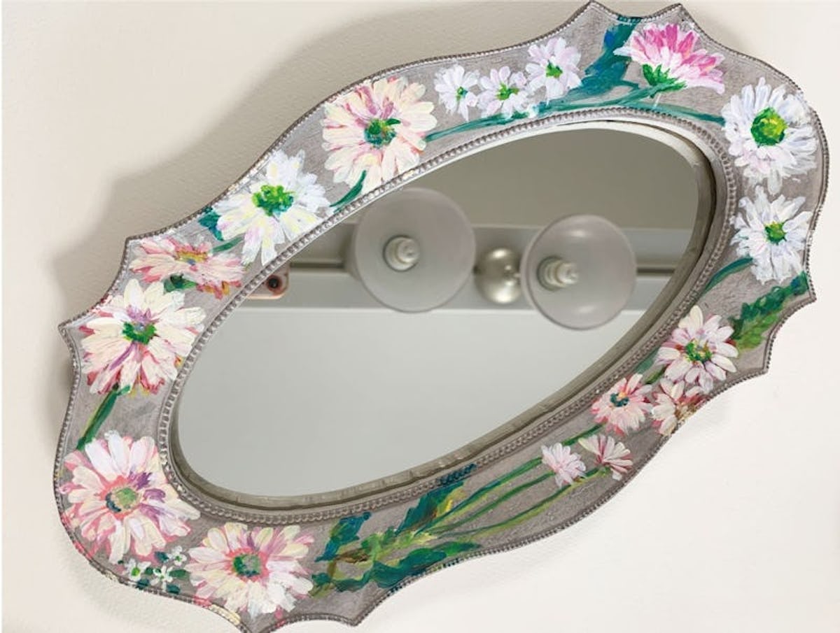 花柄のフレームが素敵な鏡ですね。フレームの形も独特で、アンティークな印象を受けます。