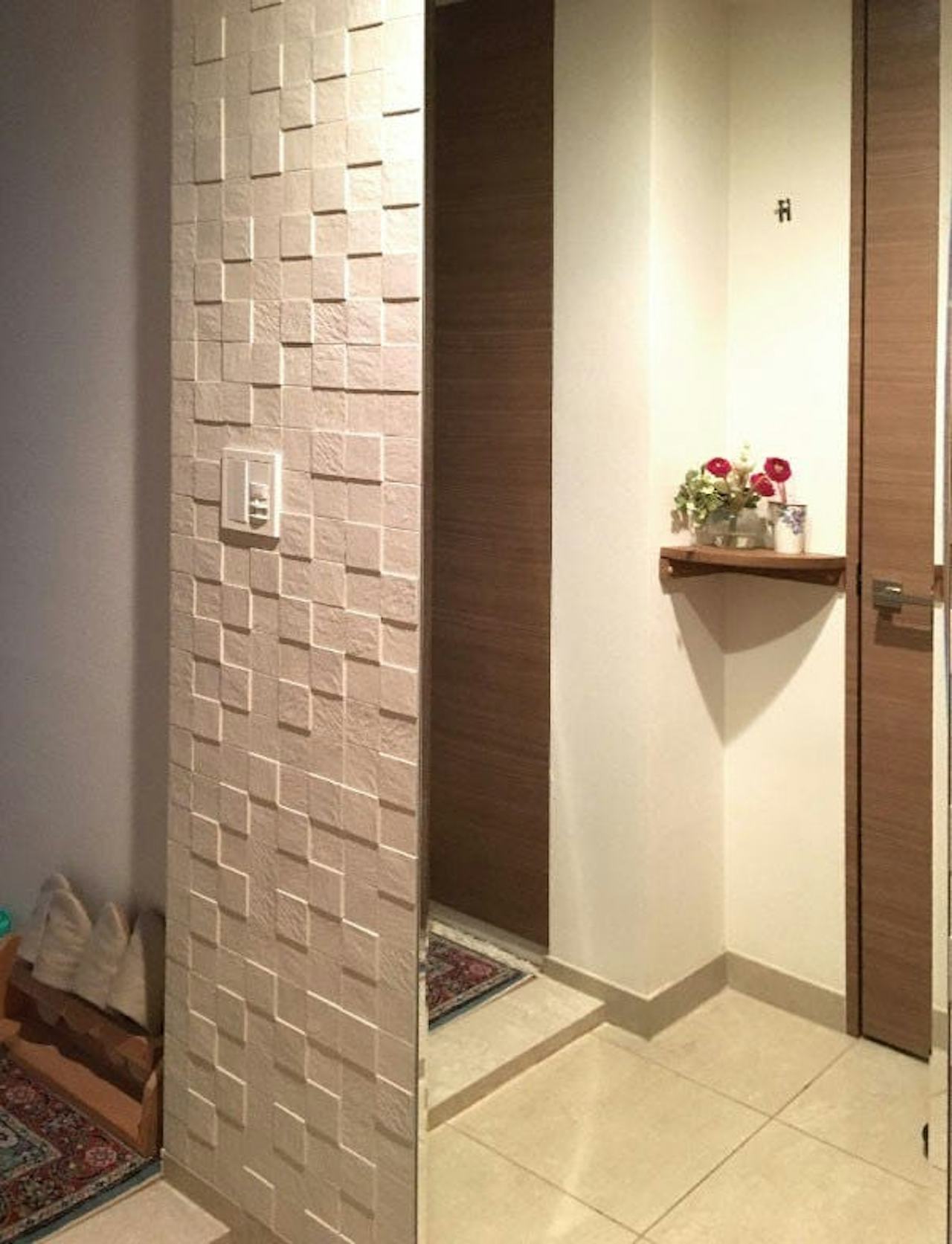 こちらのお客様は、エコカラットを使用して玄関をオシャレにDIYされています。姿見もお客様ご自身で取り付けていただきました。