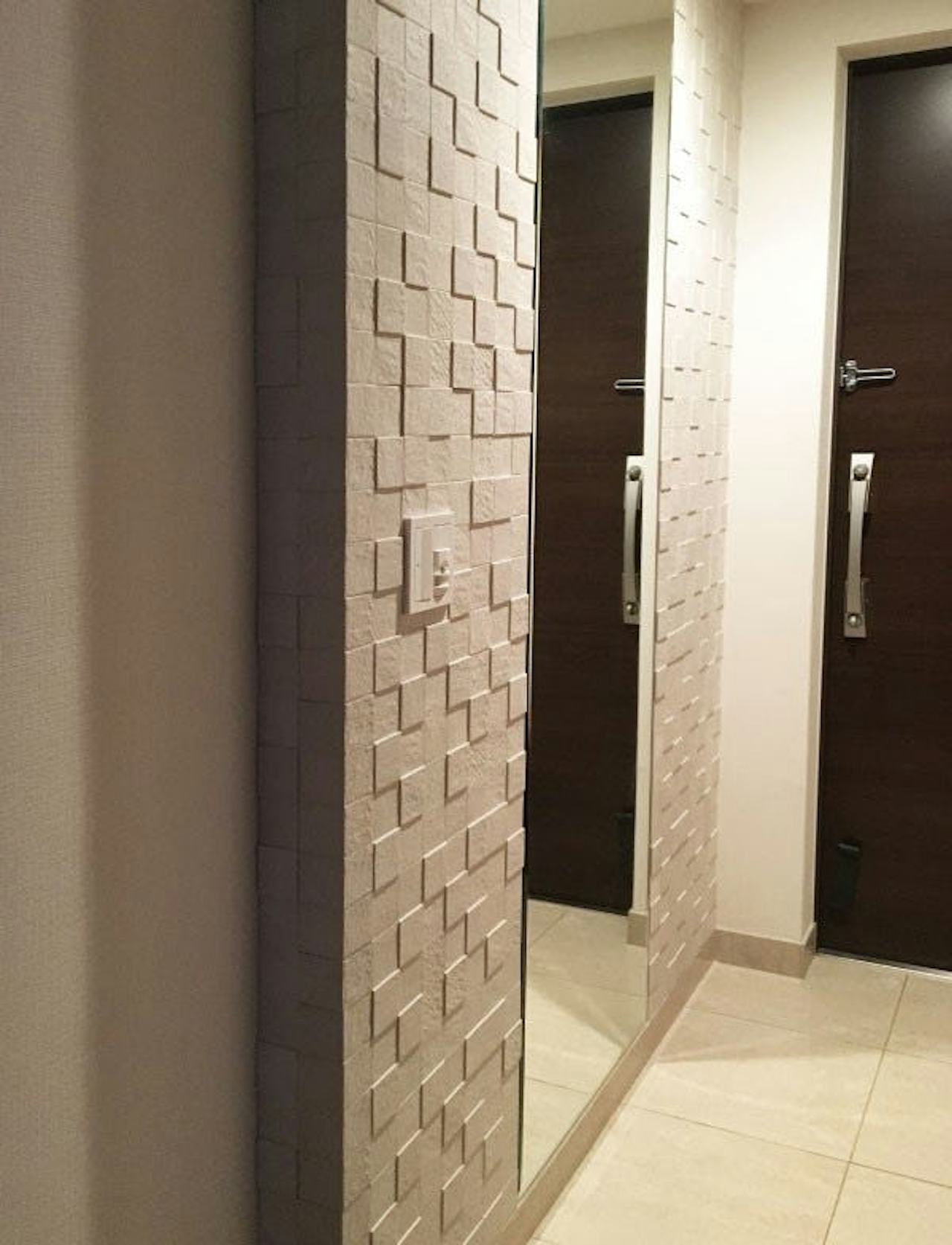 高さが天井まである、大きな姿見を設置されました。エコカラットで装飾された壁がとてもオシャレですね。デザイン性があって他にはない玄関になっています。