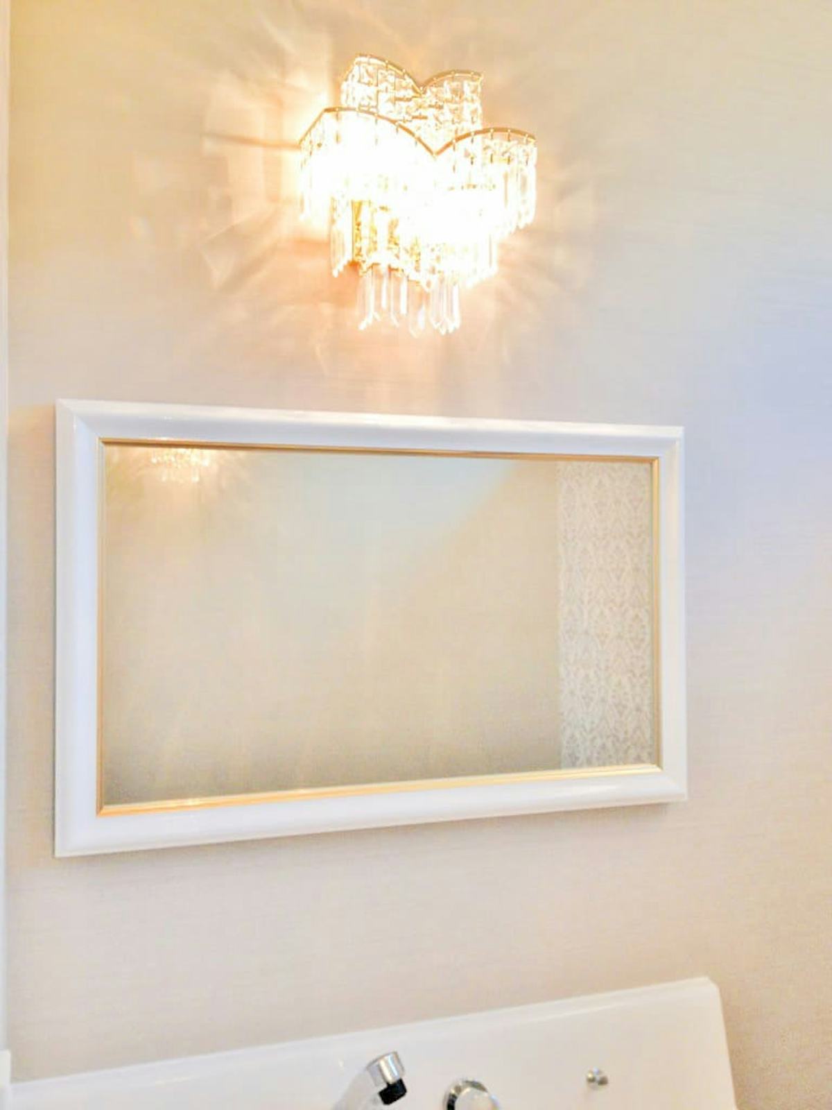 煌めく照明が印象的な、洋風のお洒落な洗面所です。そこに設置されているのが、太枠の美しいアンティークミラー。明るい白色が、洗面所を清潔感のある印象にしてくれます。