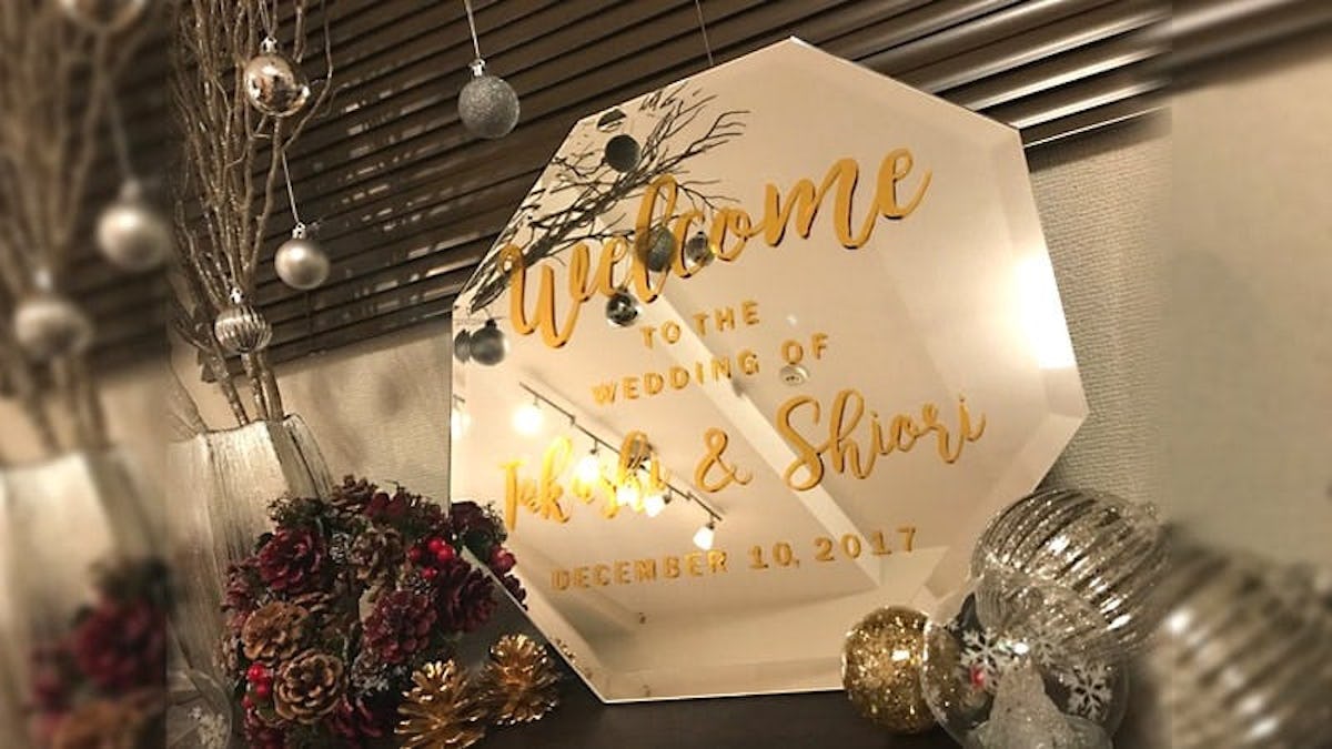 「ウェルカムボードならぬウェルカムミラーを使用したい」とのことで、鏡にカッティングシートを貼って作られています。金色の文字との相性もぴったりですね。また、縁起のいい八角形の鏡なので、運気もアップしそうです。カッティングシートを剥がせば鏡として使用いただけるので、思い出の品を長く使用していただけますよ。