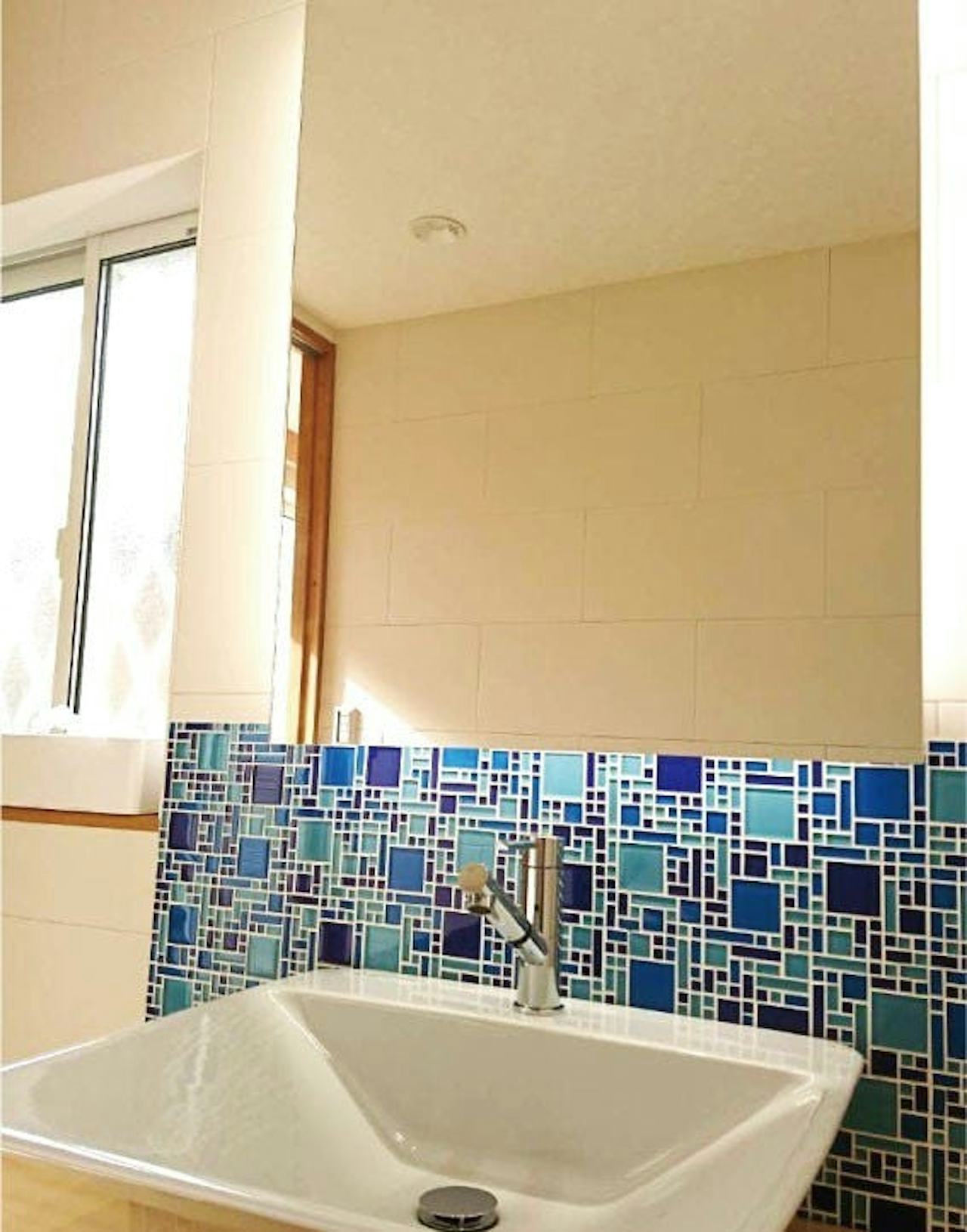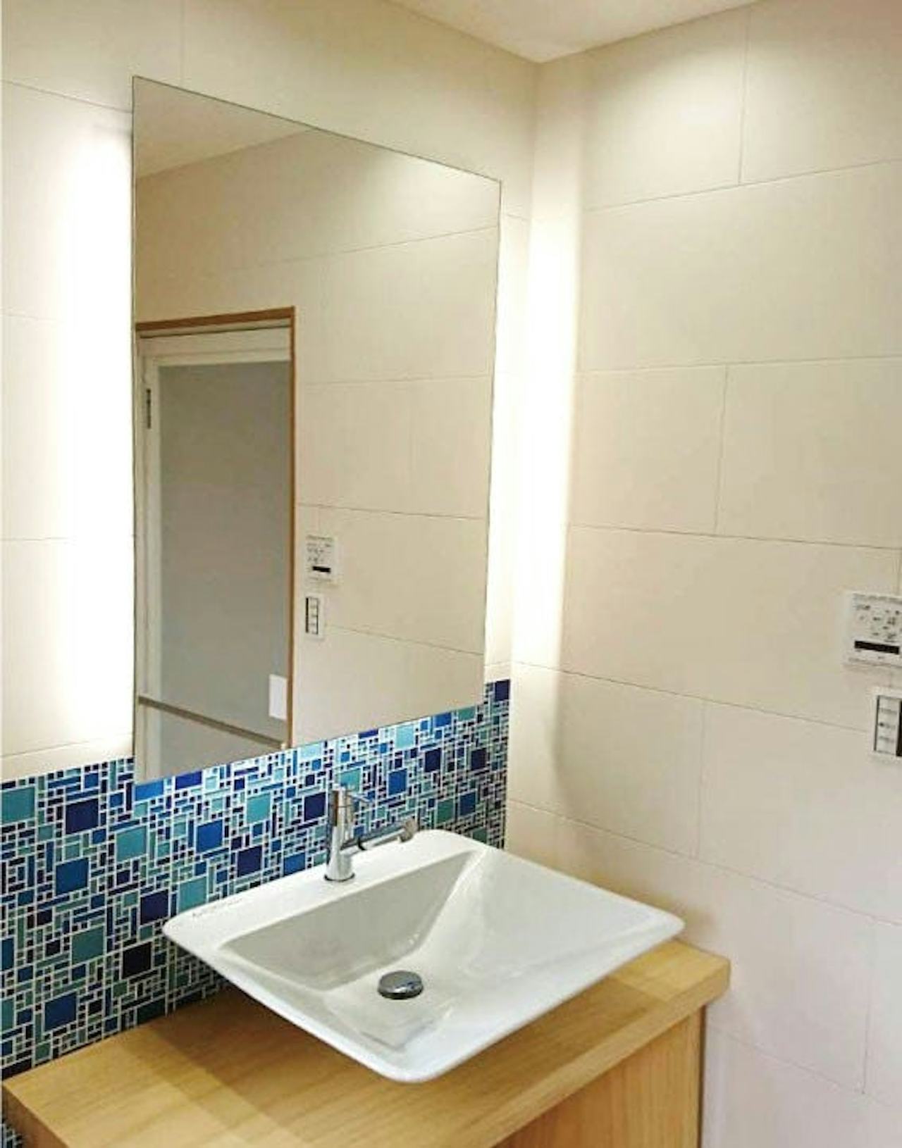 青を基調としたタイルがキレイに並んでいますね。涼しげでさわやかな洗面所になりましたね。ご自分で制作されたそうですが、とても素敵な仕上がりになっています。「高精彩ミラー」は肌の色も忠実に映し出してくれるので洗面所にはぴったりの鏡です。メイクをする際にもありがたいですよね。
