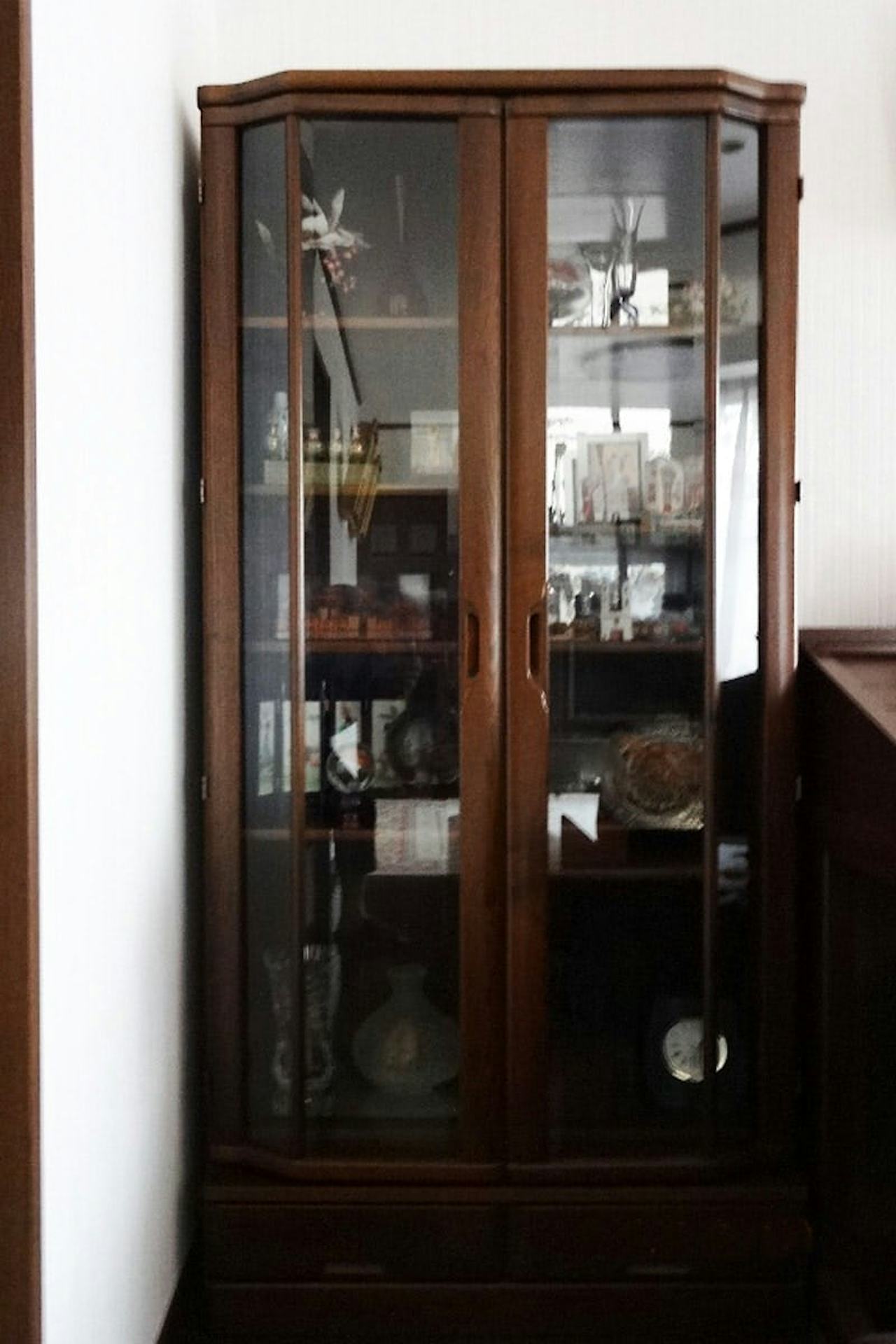 鏡貼り付け前のお写真がこちら。立派な棚ですが、中が暗くせっかくのコレクションが見えづらいですね。こちらの棚に鏡を貼り付けていきます。