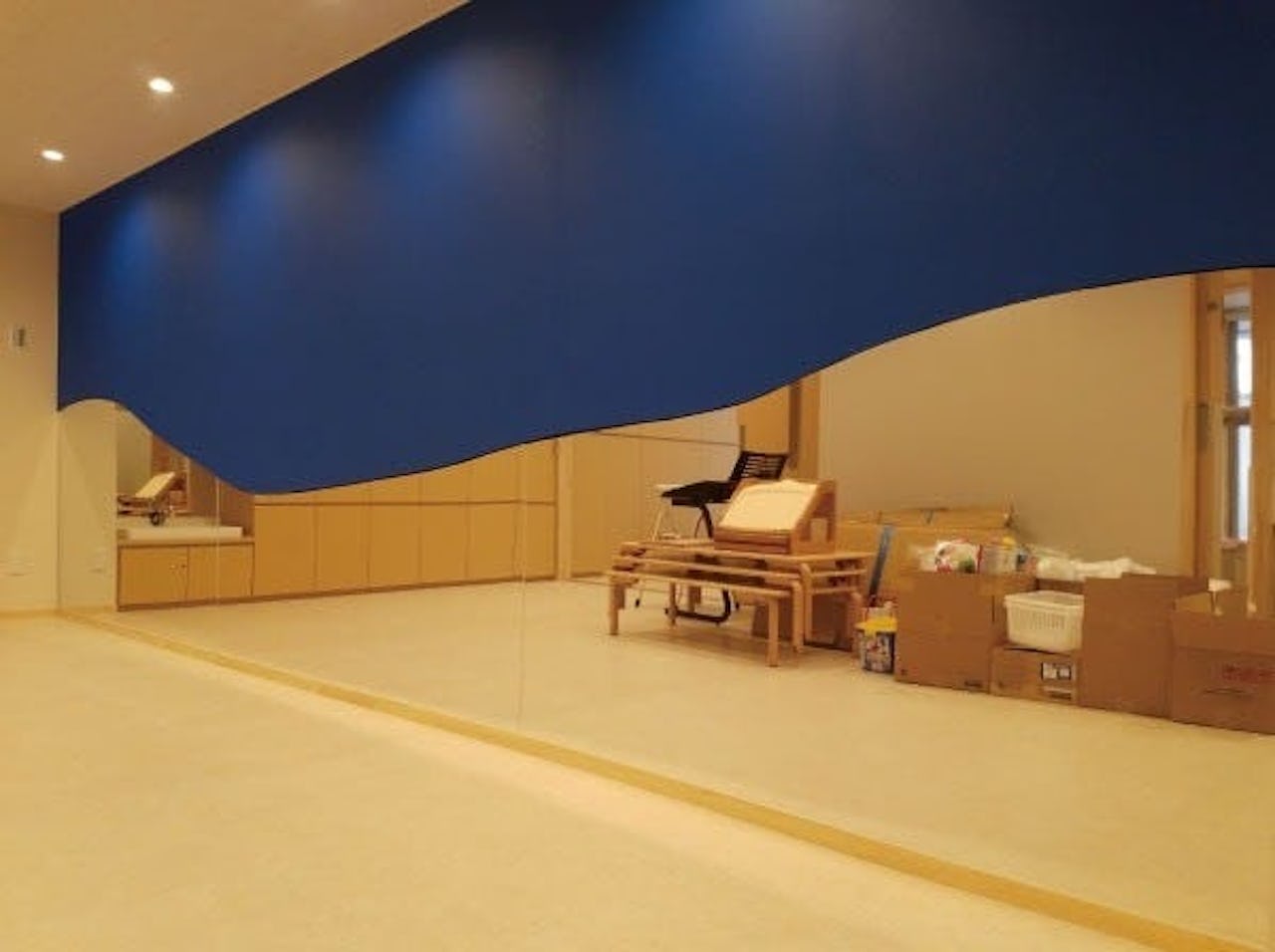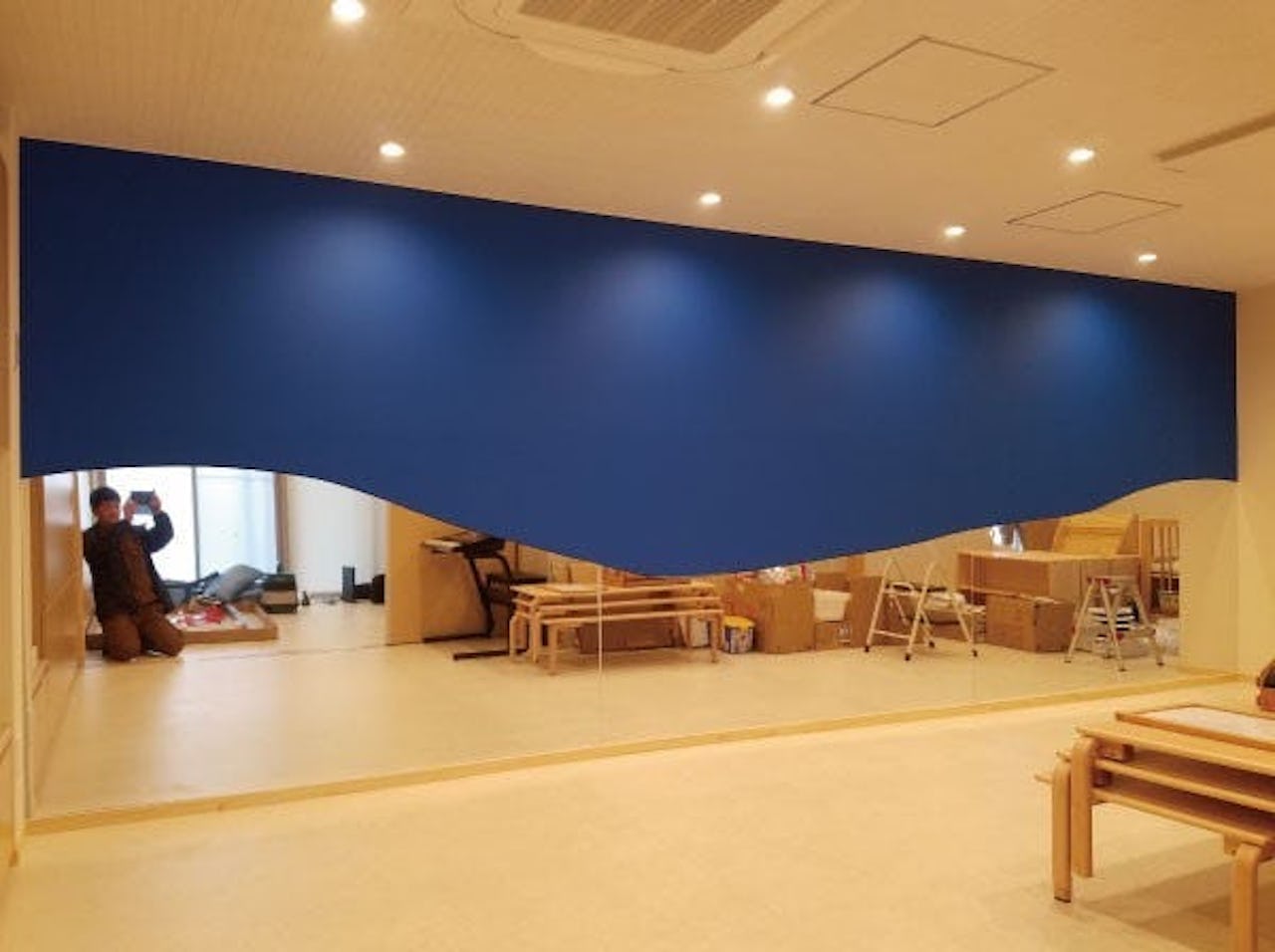 青色の壁紙と鏡を組み合わせて壁面装飾されています。波を打つようなデザインで、まるで海の中にいるみたいですね。一面鏡張りにするのではなく遊び心を持たせることで、子供たちも楽しくのびのびと過ごせる空間になりました。