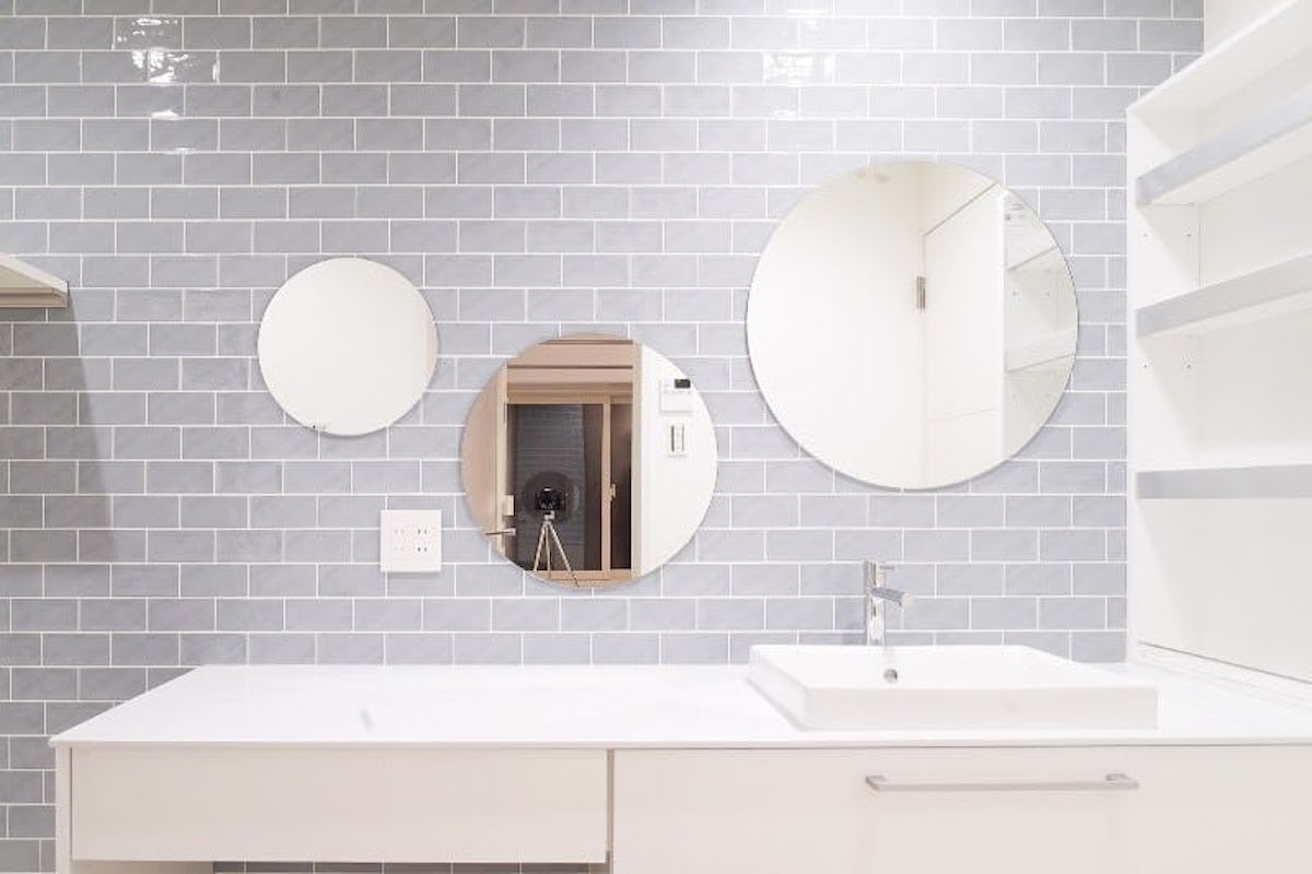淡いグレーのタイルと円形のミラーが洗面所全体を優しい雰囲気にしてくれますね。優しい雰囲気のある洗面所には、柔らかい印象を与えてくれる円形ミラーがぴったりです。大小様々なサイズの鏡をバランスよく配置されているので、シンプルながら飽きのこない素敵な洗面所が完成しましたね。
