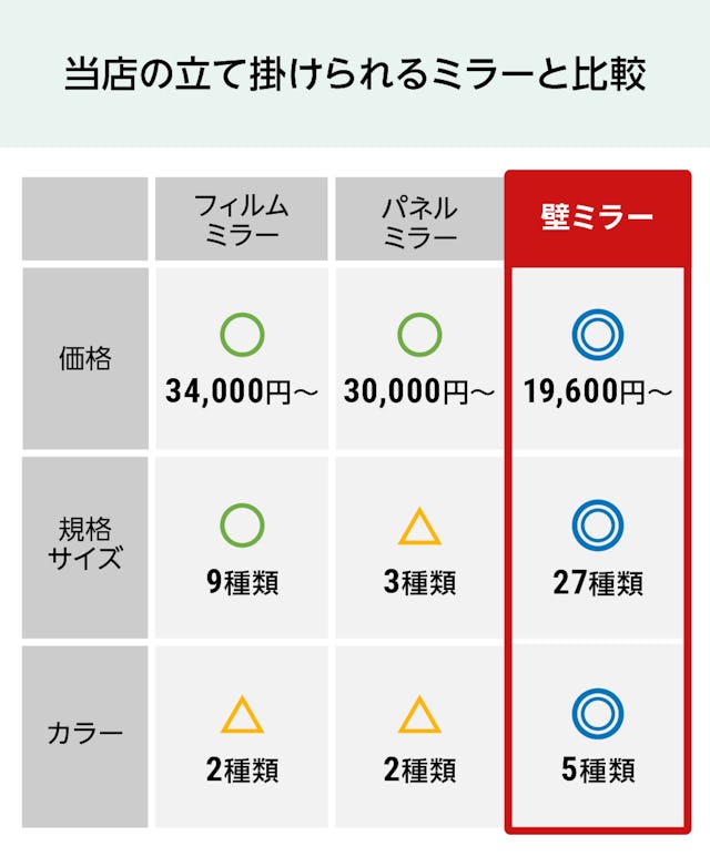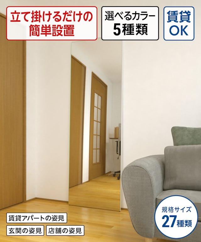 | 特徴 | ・立て掛けられる鏡 ・パネルのカラーは全部で5色 ・滑り止め防止のゴム脚で鏡の転倒を防止 ・定番サイズは27種類から選べる |