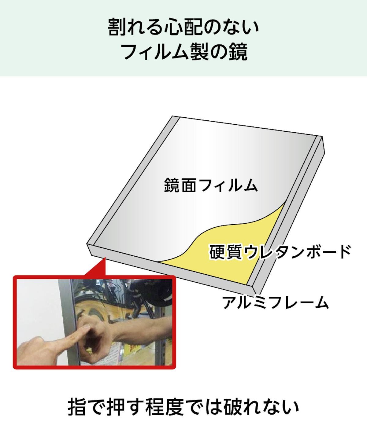 フィルムミラー(リフェクスミラー)の特徴①子供や女性でも運べる軽量な鏡、②割れないフィルム製の鏡、③壁を傷つけないから賃貸でも使用可能、④反射率が高く映りが綺麗