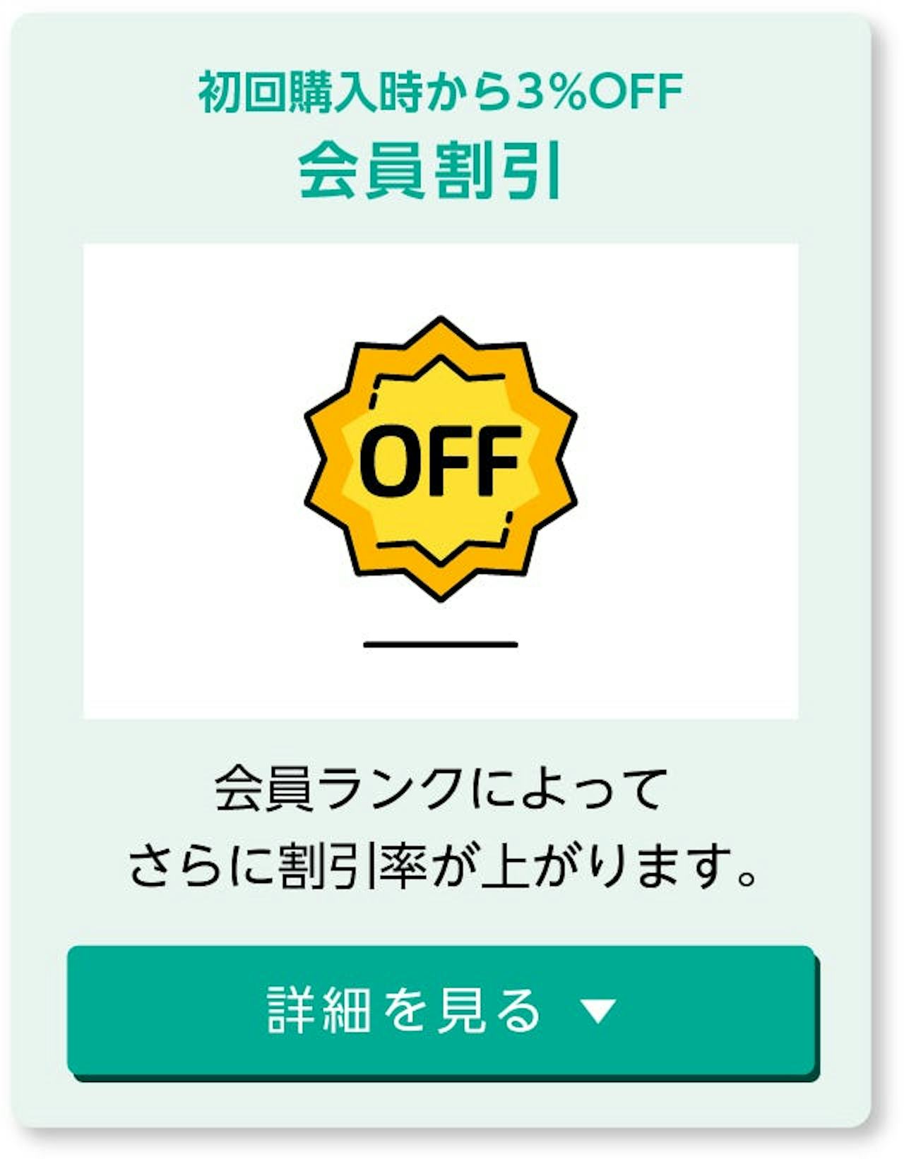 ご購入回数・ご購入金額によって会員ランクが上がり、割引率がアップします。