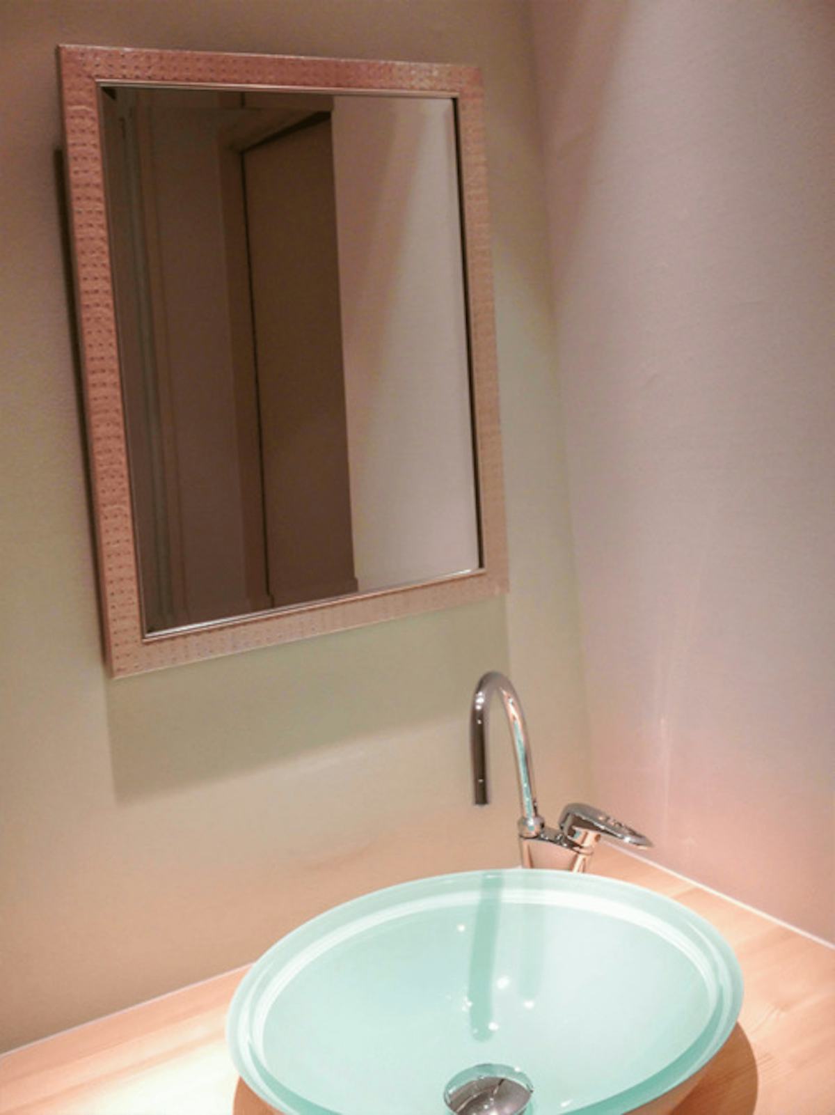 左の写真のように鏡の縁を斜めにカットすることを、面取り加工 (広幅面取り)と言います。この事例でも、鏡の縁がアレンジされていましたね。