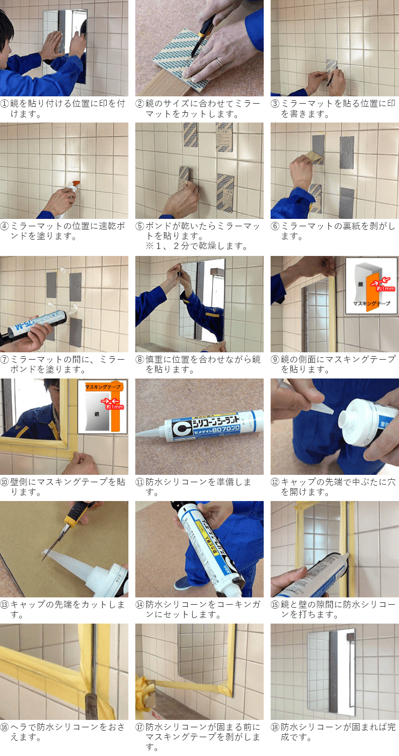| 使用部材 | ①速乾ボンド ②ミラーマット ③ミラーボンド ④防水シリコーン ⑤マスキングテープ |
